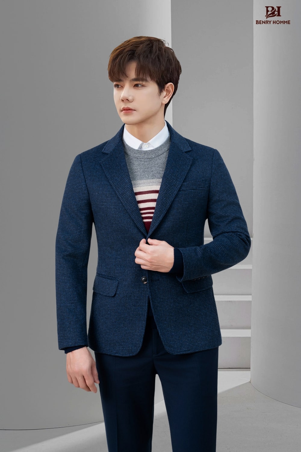 Áo blazer dạ lông cừu màu pha lẫn xanh navy và đen, mã áo JK56218NVY