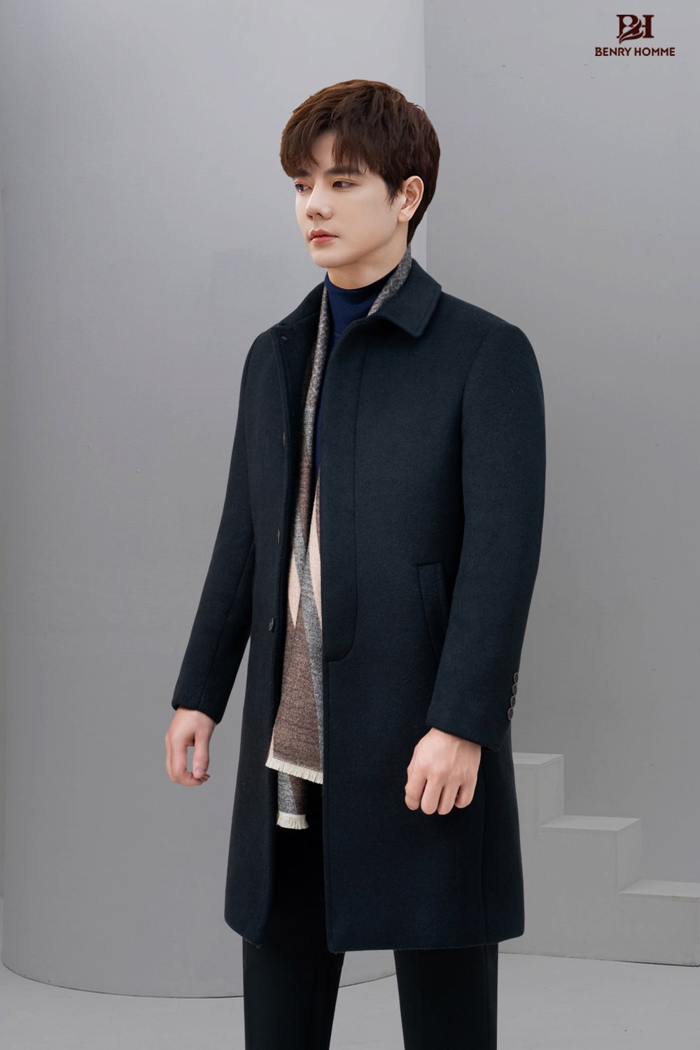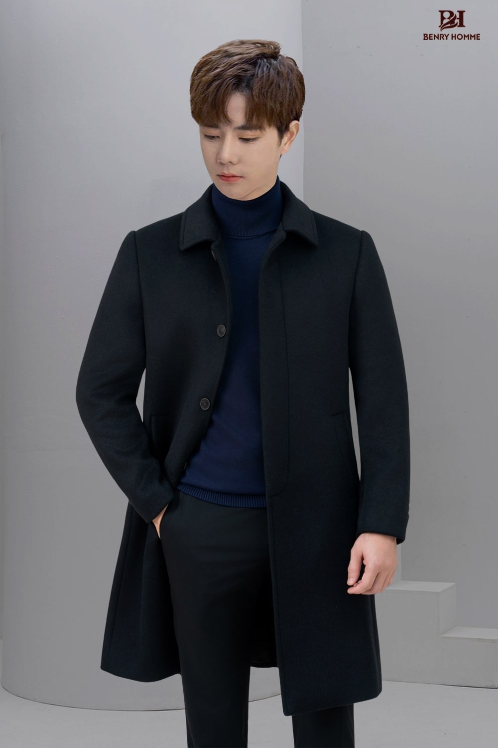 Áo dạ nam dáng dài màu đen, dạ ITALY, mã áo JK29158BLK