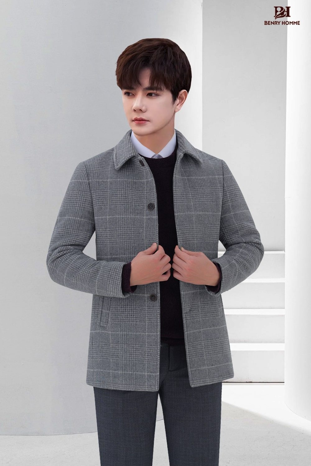 Áo dạ nam dáng ngắn màu ghi sáng, dạ WOOL & CASHMERE, mã áo TC29115LGR