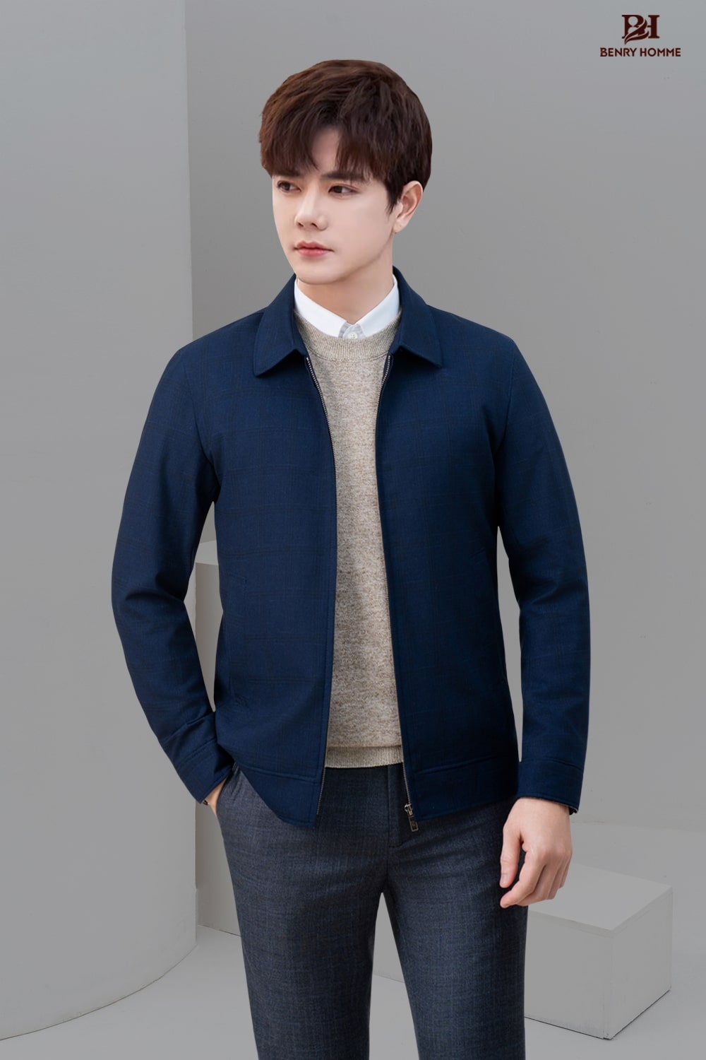 Áo khoác nam màu xanh than sọc nâu mờ, mã áo JK18177DNV