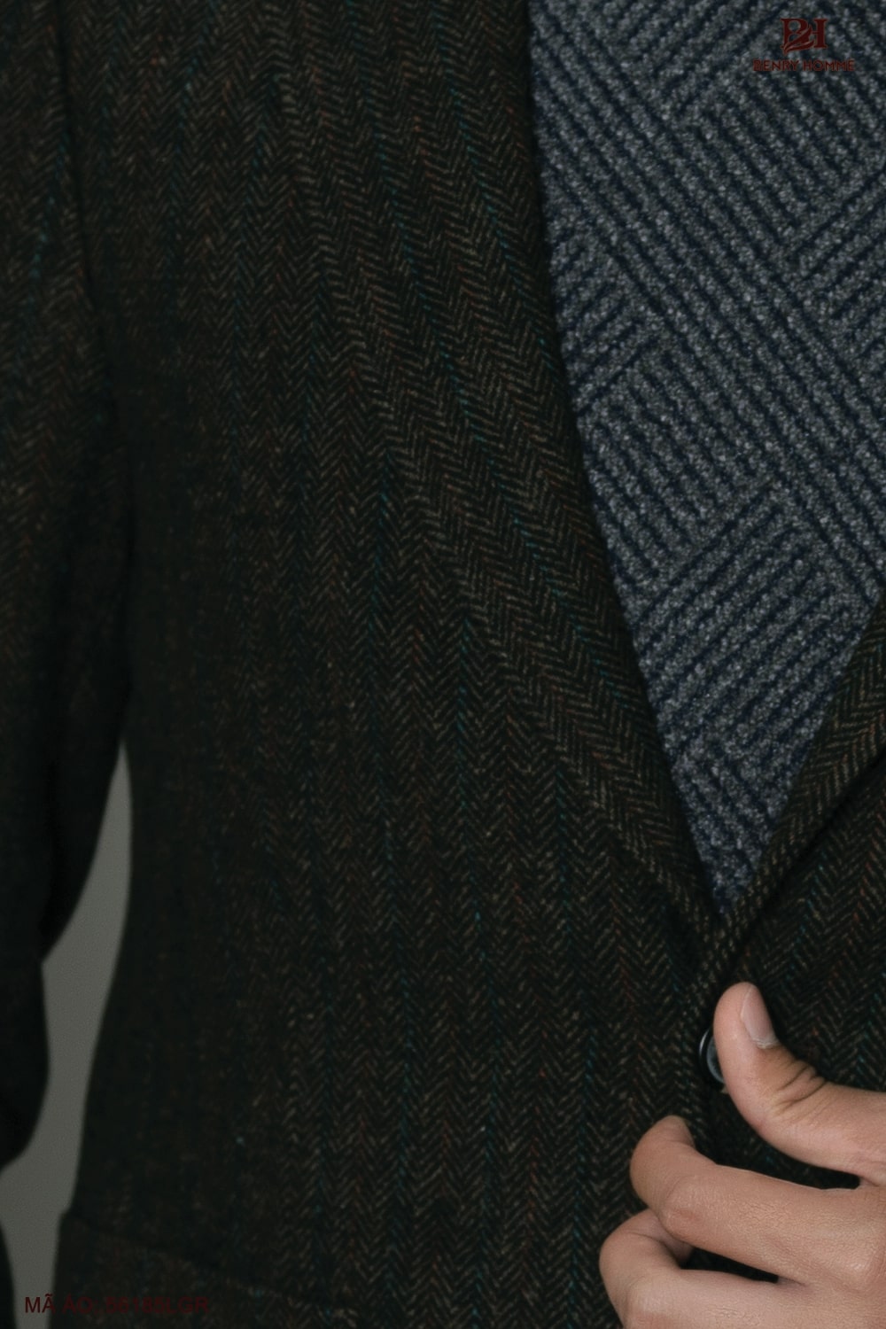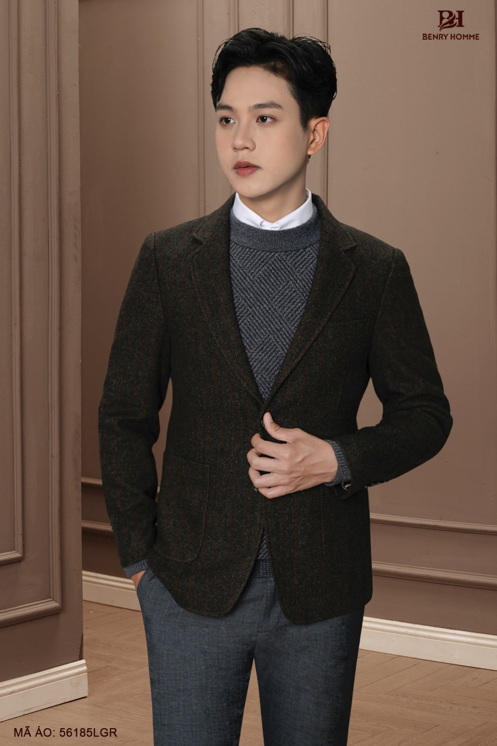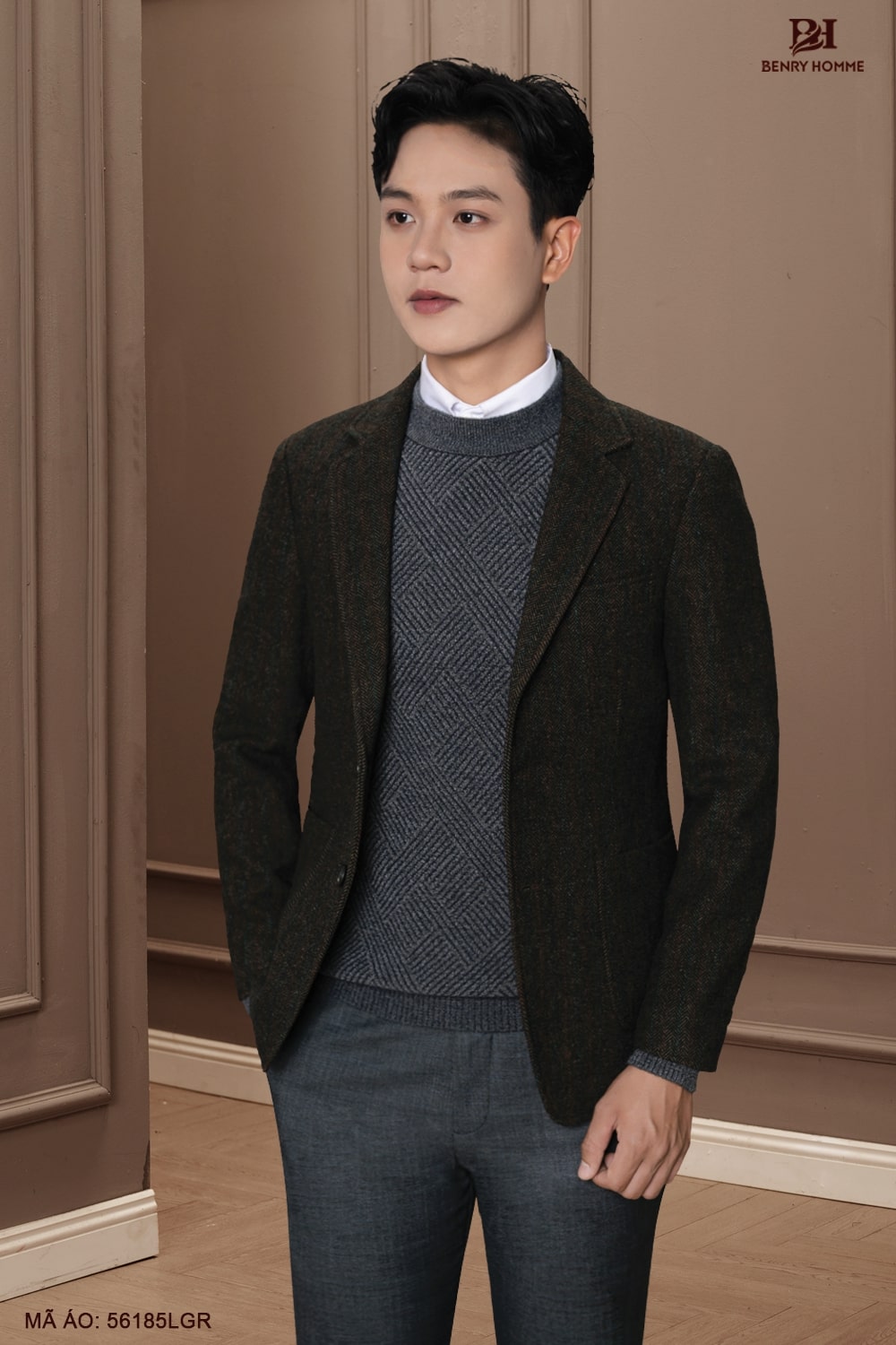 Áo blazer nam dạ lông cừu, họa tiết xương cá màu ghi xanh, mã áo JK56185LGR