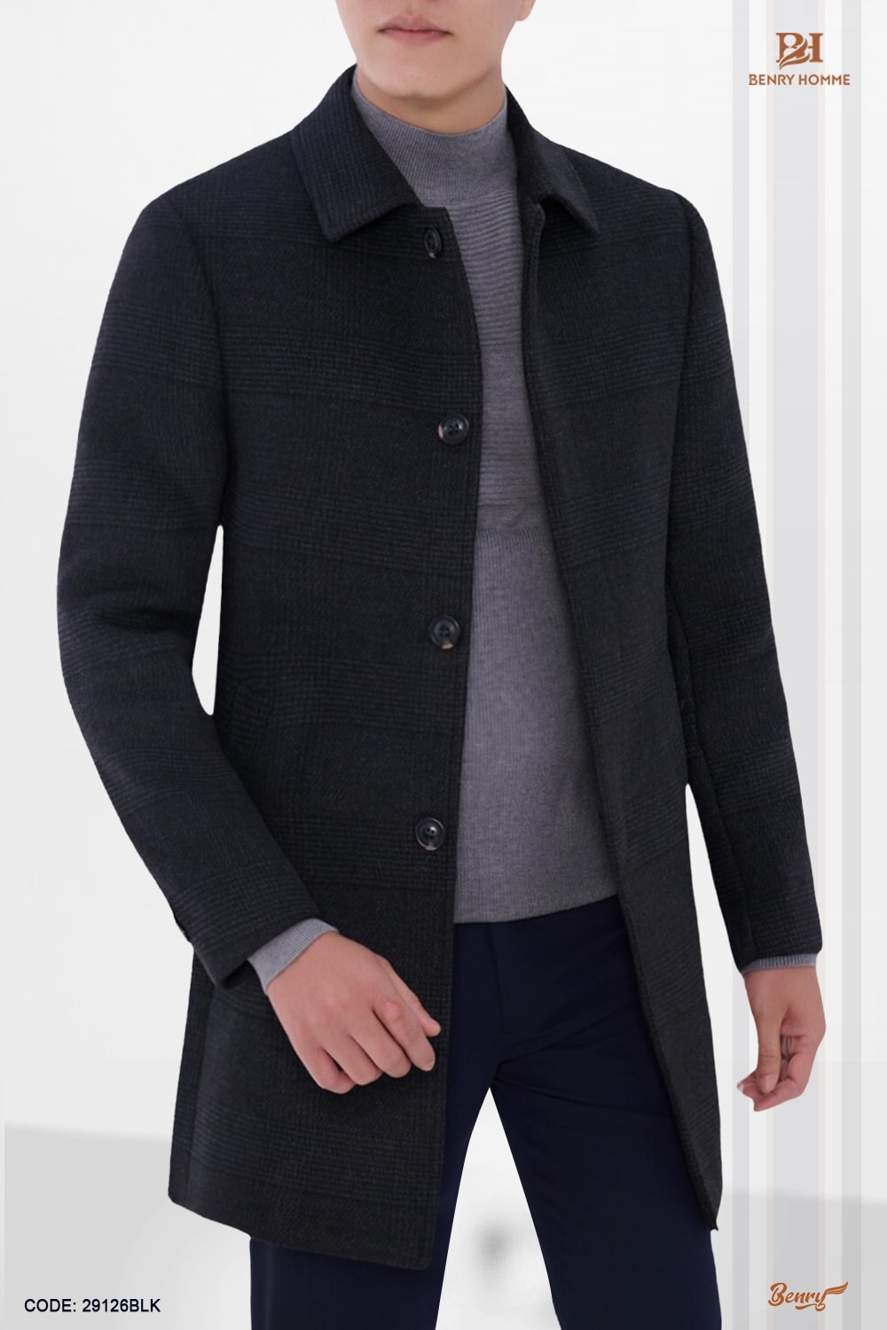 Áo dạ nam dáng dài, dạ lông cừu, màu đen sọc ghi, Mã áo TC29126BLK